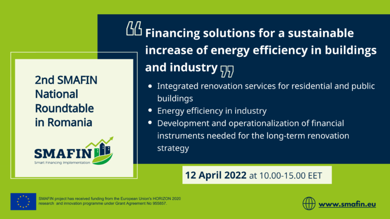 The 2nd SMAFIN National Roundtable in Romania will be held on April 12th at 10.00-15.00 EET. The roundtable will consist of 3 parallelsessions: ✔️ Integrated renovation services for residential and public buildings ✔️ Energyefficiency in industry ✔️ Development and operationalization of financial instruments needed for the long-term renovation strategy. More information on the Agenda and…